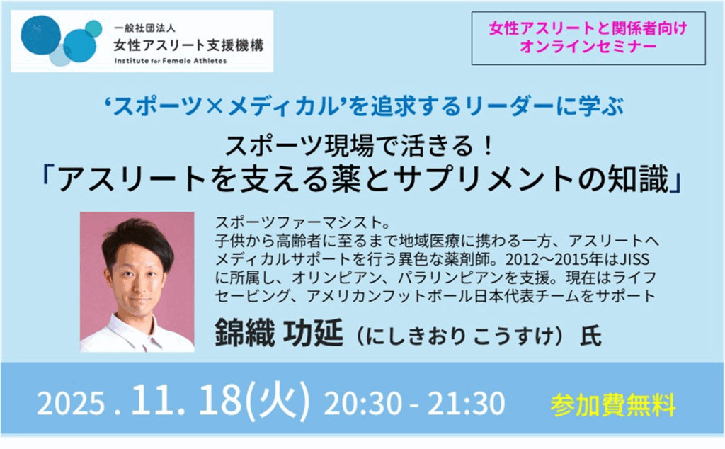 【オンライン・無料(11/18)】女性アスリートの皆さんの健康とパフォーマンスを支えるために必要な薬やサプリメントの基礎知識を、最新の知見や事例とともに解説するセミナーです。